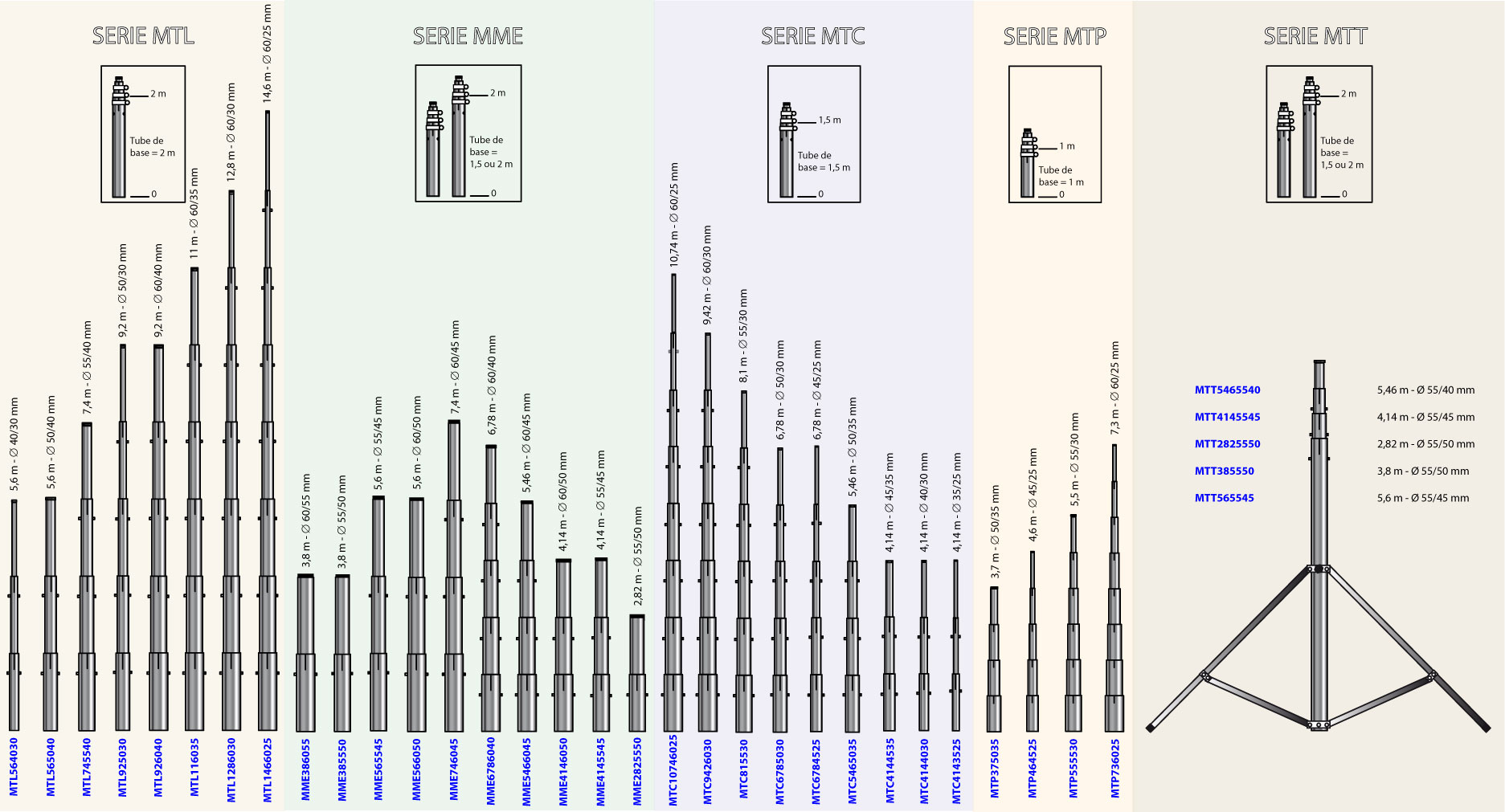 ITA propose des mâts télescopiques réalisés en tubes d'aluminium et destinés à un usage ponctuel ou temporaire, ne nécessitant pas d'ancrage définitif au sol. Trois longueurs de tubes sont disponibles : 1, 1,5 m ou 2 m. Selon le modèle, les diamètres extérieurs varient entre 25 et 70 mm et la longueur entre 2,82 m et 16,85 m (mât déployé).