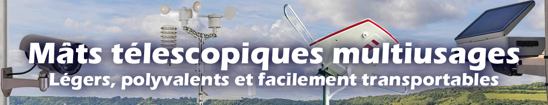Le mât télescopique "léger" en aluminium est l'outil idéal pour un usage en "portable", hisser des charges légères et offrant peu de prise au vent telles que des appareils de mesures ou photographiques, une caméra, un microphone, un répéteur Wi-Fi, des antennes radio/TV, une station météo, un drapeau, de l'éclairage, une petite manche à air, etc.