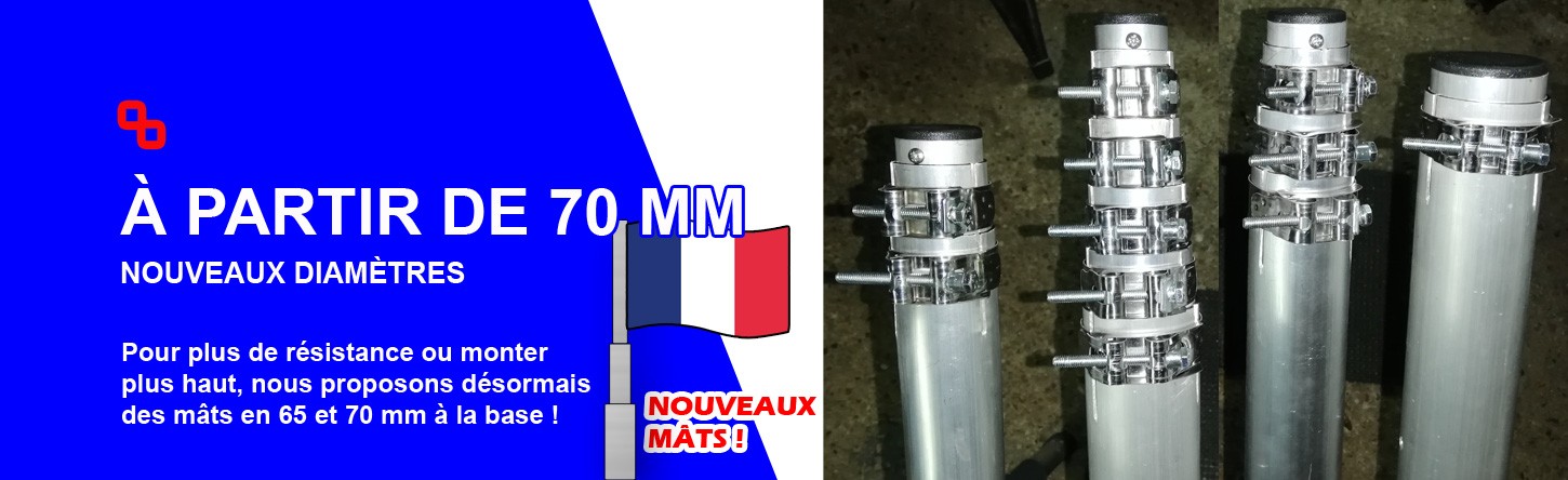 Pour une protection accrue des équipements placés au sommet du mât, pour chaque jonction entre les tubes, nous utilisons un collier à tourillons renforcé et une vis de "sécurité" qui traverse transversalement le tube inférieur.